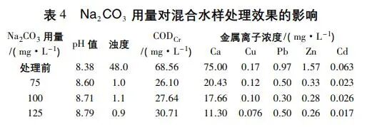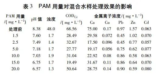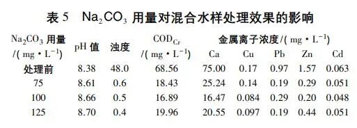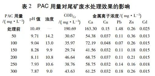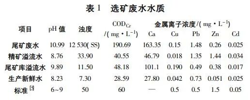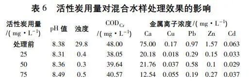 选矿生产过程中排放的废水中常含有残留选矿药剂、固体悬浮物以及重金属离子等物质,导致选矿产生的尾矿废水处理难度大、回用困难,同时选矿废水中Pb2+、Cu2+、Zn2+等重金属离子含量高,导致选矿废水直接排放会严重污染流域内土壤和水体环境。我国矿山选矿废水排放量约占全国工业废水总排放量的10%,而铅锌选矿废水的处理较困难,存在处理费用高、回用水质不达标等问题,因此选矿废水经济有效地处理及回用是仍需长期深入探索解决的技术难题。 目前国内外关于选矿废水处理的研究主要是有机物的降解和重金属离子的去除,对于难沉降悬浮物的去除主要是采用传统的混凝剂聚合氯化铝(PAC)进行处理;在有机物的去除方法中,电凝法、化学氧化法及混凝沉降法较为成熟,吸附法和生物降解法成本较高。同时采用多种方法处理废水已成为重要趋势。本文以四川某铅锌选矿废水为研究对象,对该选矿废水进行混凝试验、除钙试验、活性炭吸附试验以及处理水回用试验研究,综合多种处理方法以实现该选矿废水的深度净化及回用。四川某铅锌选矿废水主要来源为精矿溢流水、尾矿废水、尾矿库溢流水、车间外排水。车间外排水水量少,普遍采用简单沉淀后直接回用。为查明影响废水净化及回用的原因,对该水样进行了水质分析,结果见表1。由表1分析可知,尾矿废水、精矿溢流水中重金属Pb含量超过GB25466—2010《铅锌工业污染物排放标准》(直接排放)要求;尾矿废水固体悬浮物(SS)、CODCr含量超过GB25466—2010(直接排放)要求。选矿废水在尾矿库中停留期间,由于沉淀、氧化、吸附、生化等作用,废水有一定程度的自净,但由于重金属Pb含量高,仍难以达标排放;尾矿库溢流水水质达到GB25466—2010(直接排放)要求。试验药剂聚合氯化铝(PAC)、聚丙烯酰胺(PAM)以及碳酸钠,分别配置成质量浓度20%、0.1%和10%的溶液使用;粉末状活性炭直接使用。试验所用仪器主要有混凝试验搅拌仪、浊度仪、雷磁pH计、电子天平以及玻璃器皿等。 选矿废水的处理及回用始终是矿产资源清洁开发利用的附加难题,近年来众多学者对选矿废水的处理回用工艺进行了深入研究,研发了物理法、化学法、生物法等工艺,为矿山企业开展环境保护工作、实现可持续发展提供了大量技术支撑。为高效处理并回用某铅锌多金属矿选矿废水,本文采用混凝沉淀工艺结合除碳和活性炭吸附处理,并进行处理水回用试验研究,实现选矿废水全部回用,提高选矿厂经济效益。聚合氯化铝(PAC)与聚丙烯酰胺(PAM)是目前应用最广泛的混凝剂。PAC主要是通过其水解产物的压缩双电层、电性中和、网捕卷扫以及吸附桥连等4个方面的作用来去除有机污染物。而PAM是大分子混凝剂,具有在颗粒间形成更大絮体并由此产生巨大表面吸附作用。固定PAM用量5mg/L,选取PAC为混凝剂,研究了PAC用量对尾矿废水处理效果的影响,结果见表2。试验现象表明,处理后出水澄清、无色,且絮体颗粒沉降时间短。由表2结果分析可知,在PAM和PAC用量分别为5mg/L和50mg/L时,废水pH值降至9.71,CODCr降至30.67mg/L,且金属离子浓度均可达到GB25466—2010(直接排放)要求。因此混凝法处理尾矿废水的最佳药剂用量为5mg/LPAM+50mg/LPAC。为了保障处理后选矿废水可直接回用于选矿生产,且不影响其选别工艺指标,模拟现场选矿废水水样,即取静沉20min后的尾矿废水上清液与精矿溢流水进行混合,比例为V尾矿废水上清液∶V精矿溢流水=3∶2,以该混合水样为试验用水,选取PAC为混凝剂,在PAC用量50mg/L条件下,研究了PAM用量对混合水样处理效果的影响,结果见表3。试验现象表明,处理前混合水样水质略浑浊,悬浮物浓度略高;处理后出水澄清、无色,且絮体颗粒沉降时间短。由表3可知,在处理后出水水质可达标排放或回用于选矿生产的前提下,PAC用量50mg/L、PAM用量1.5mg/L时,混合水样pH值降至7.60,CODCr降至28.49mg/L,各金属离子浓度均大幅度降低,各项指标均可达到GB25466—2010(直接排放)要求。因此混凝法处理混合水样的最佳药剂用量为1.5mg/LPAM+50mg/LPAC。以PAC+PAM为混凝剂时,对混合水样中重金属离子去除效果较好,但对钙离子去除效果一般,而混合水样存在重金属离子严重超标且钙含量略高,故选用“Na2CO3+PAC”对混合水样进行处理。固定PAC用量50mg/L,考察了Na2CO3用量对混合水样处理效果的影响,结果见表4。试验现象表明,混合水样经Na2CO3+PAC处理后出水澄清、无色,絮体松散且呈丝状。由表4可知,Na2CO3用量125mg/L时,处理后混合水样钙离子含量由75.0mg/L降至11.30mg/L。且处理后出水不易结垢堵管,对泵体运转影响较小。“Na2CO3+PAC”处理混合水样的最佳药剂用量为50mg/LPAC+125mg/LNa2CO3。固定PAC用量50mg/L、PAM用量1.5mg/L,采用“Na2CO3+PAC+PAM”处理混合水样,考察了Na2CO3用量对混合水样处理效果的影响,结果见表5。试验现象表明,混合水样经“Na2CO3+PAC+PAM”处理后出水澄清、无色,絮体密实且呈淡绿色。加入Na2CO3及PAC后,反应前期均无明显絮体生成,随着反应时间延长,有细小絮体生成并逐渐增大;絮凝反应2min后加入PAM,矾花明显增大;反应结束后,静沉30min,絮体沉降完全。由表5可知,Na2CO3用量100mg/L时,处理后混合水样钙离子含量由75.0mg/L降至16.47mg/L;除钙外,“Na2CO3+PAC+PAM”对该废水中其他污染物去除效果显著;PAM的加入可加速絮体的生长和沉降,减少絮体颗粒沉降时间。且处理后混合水样出水不易结垢堵管,不影响泵体