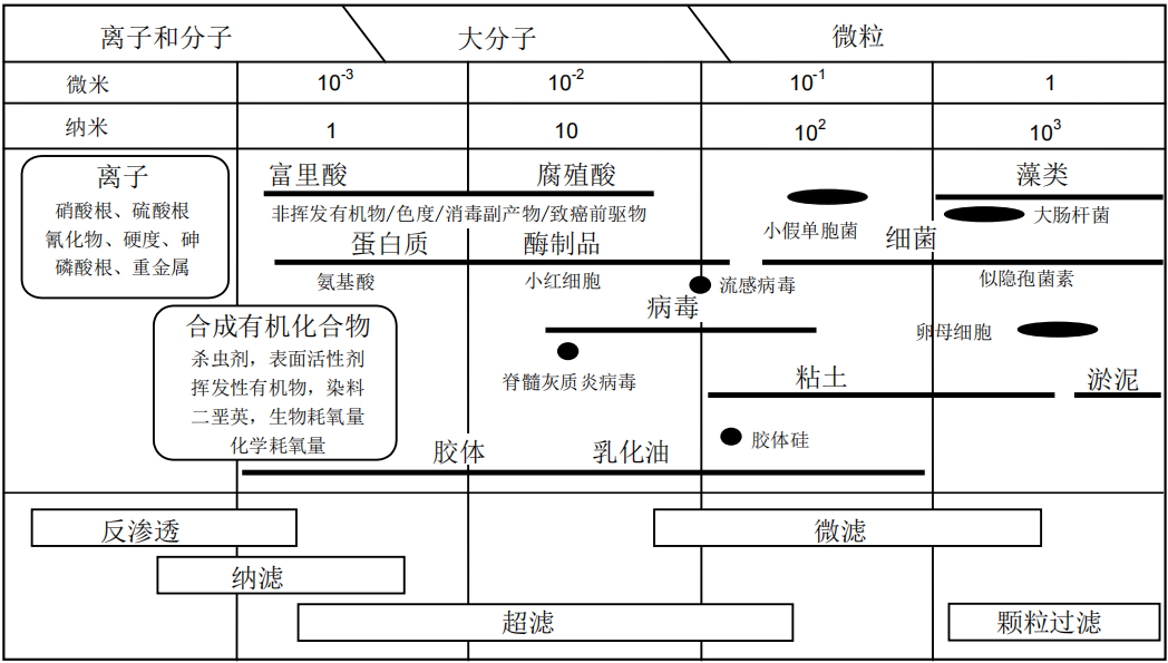 在水处理当中常见以下几种过滤膜。分别是微滤(MF)、超滤(UF)、纳滤(NF)、反 渗透(RO),那么,你知道它们过滤精度分别是多少?又能拦截哪些物质呢? 过滤精度一般在0.1-50微米,常见的各种PP滤芯,活性碳滤芯,陶瓷滤芯等都属于微滤范畴,用于简单的粗过滤,过滤水中的泥沙、铁锈等大颗粒杂质,但不能去除水中的细菌等有害物质。 滤芯通常不能清洗,为一次性过滤材料,需要经常更换。1 .PP棉芯:一般只用于要求不高的粗滤,去除水中泥沙、铁锈等大颗粒物质。2. 活性碳:可以消除水中的异色和异味,但是不能去除水中的细菌,对泥沙、铁锈的去除效果也很差。3. 陶瓷滤芯:最小过滤精度也只0.1微米,通常流量小,不易清洗。过滤精度在0.001-0.1微米,属于二十一世纪高新技术之一。是一种利用压差的膜法分离技术,可滤除水中的铁锈、泥沙、悬浮物、胶体、细菌、大分子有机物等有害物质,并能保留对人体有益的一些矿物质元素。超滤工艺是矿泉水、山泉水生产工艺中的核心部件。其中水的回收率高达95%以上,并且可方便地实现冲洗与反冲洗,不易堵塞,使用寿命相对较长。超滤不需要加电加压,仅依靠自来水压力就可进行过滤,流量大,使用成本低廉,较适合家庭饮用水的全面净化。因此未来生活饮用水的净化将以超滤技术为主,并结合其他的过滤材料,以达到较宽的处理范围,更全面地消除水中的污染物质。过滤精度介于超滤和反渗透之间,脱盐率比反渗透低,也是一种需要加电、加压的膜法分离技术,水的回收率较低。也就是说用纳滤膜制水的过程中,一定会浪费将近30%的自来水。这是一般家庭不能接受的,一般用于工业纯水制造。RO是英文 Reverse Osmosis membrane 的缩写,中文意思是(逆渗透),一般水的流动方式是由低浓度流向高浓度,水一旦加压之后,将由高浓度流向低浓度,亦即所谓逆渗透原理:由于 RO 膜的孔径是头发丝的一百万分之五( 0.0001 微米) , 一般肉眼无法看到,细菌、病毒是它的 5000 倍。因此,只有水分子及部分有益人体的矿物离子能够通过,其它杂质及重金属均由废水管排出,所有海水淡化的过程,以及太空人废水回收处理均采用此方法,因此 RO 膜又称体外的高科技人工肾脏。(膜的拦截能力) 超滤原理是一种膜分离过程原理,超滤利用一种压力活性膜,在外界推动力(压力)作用下截留水中胶体、颗粒和分子量相对较高的物质,而水和小的溶质颗粒透过膜的分离过程。通过膜表面的微孔筛选可截留分子量大的物质。溶解、扩散原理:渗透物溶解在膜中,并沿着它的推动力梯度扩散传递,在纳滤膜的表面形成物相之间的化学平衡。b.电效应:纳滤膜与电解质离子间形成静电作用,电解质盐离子的电荷强度不同,造成膜对离子的截留率有差异,在含有不同价态离子的多元体系中,由于道南(DONNAN)效应,使得膜对不同离子的选择性不一样,不同的离子通过膜的比例也不相同。 纳滤过程之所以具有离子选择性,是由于在纳滤膜上或者膜中有负的带电基团,它们通过静电互相作用,阻碍多价离子的渗透。纳滤膜可能的电荷密度为0.5~2meq/g。 纳滤膜介于RO与UF膜之间。反渗透原理就是在有盐分的水中(如原水),施以比自然渗透压力更大的压力,使渗透向相反方向进行,把原水中的水分子压力到膜的另一边,变成洁净的水,从而达到除去水中杂质、盐分的目的。实质是脱水技术。
